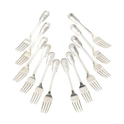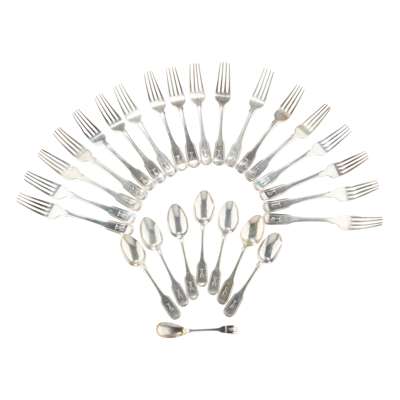 Of Fiddle pattern with cast crest of Dennistoun, comprising, twelve table forks, eighteen dessert forks and seven teaspoons
