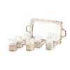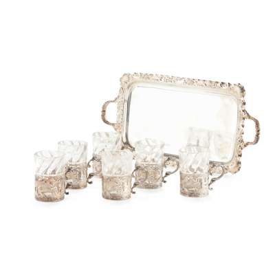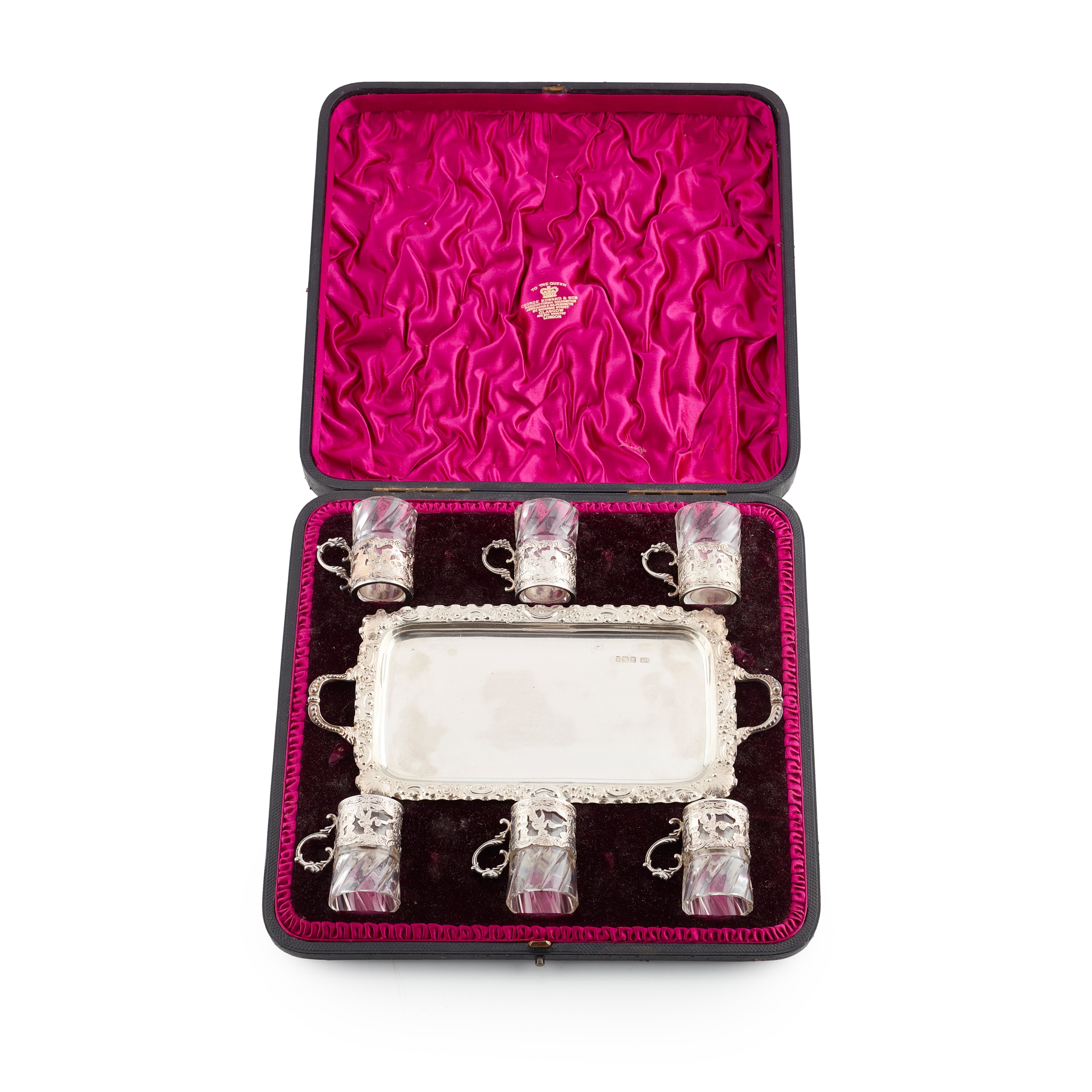 Retailed by Edwards, comprising a small two handled tray and a set of plain glasses, each in a silver frame