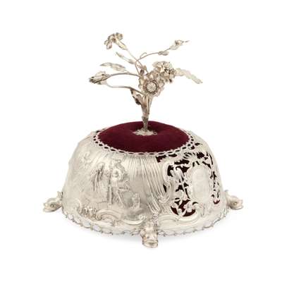 Marks indistinct, of bun shape, on four feet with floral spray centrepiece, pierced and chased sides