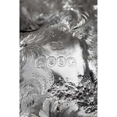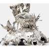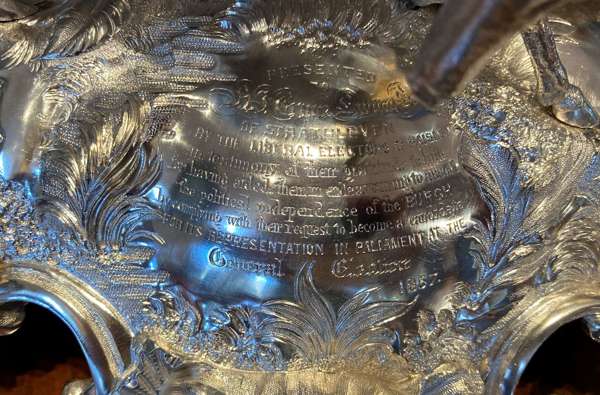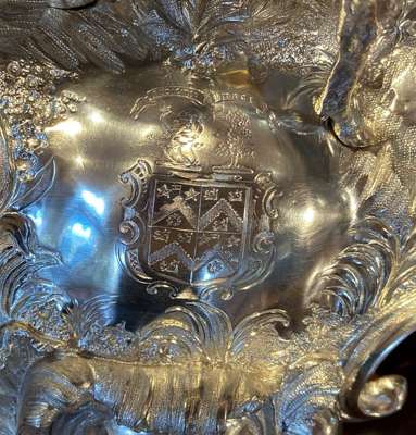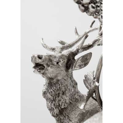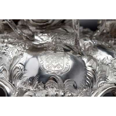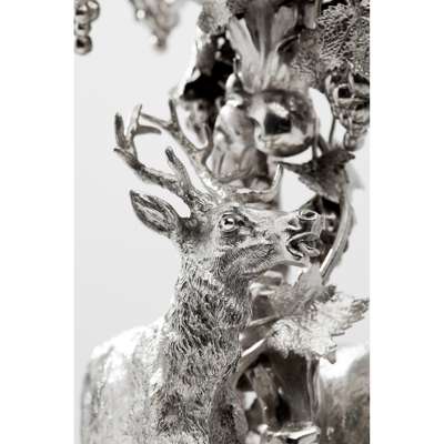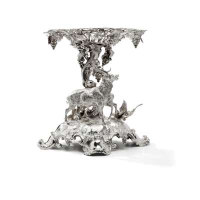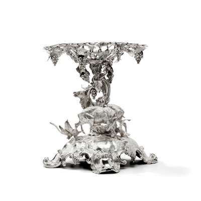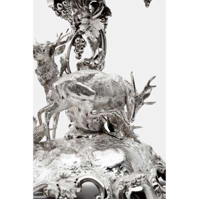 On shaped oval foot, the openwork basket on vine foliage stem flanked by a stag and hind, engraved presentation inscription to J Crum Ewing dated 1857