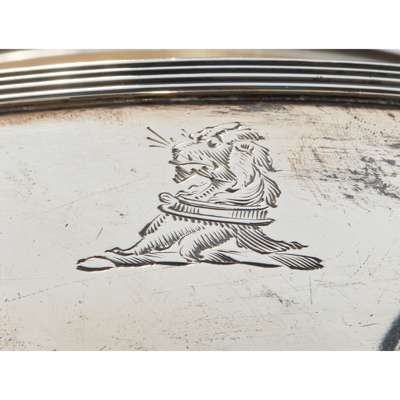 Of traditional form, engraved with a crest of a collared lion's head, on an oval reeded foot, the cover with an acorn finial