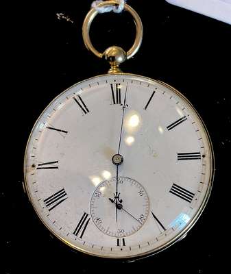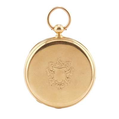 The rear cover with engine turned decoration and blank cartouche, white enamel dial with Roman numerals in black, subsidiary seconds at 6, key wind movement, No.76888