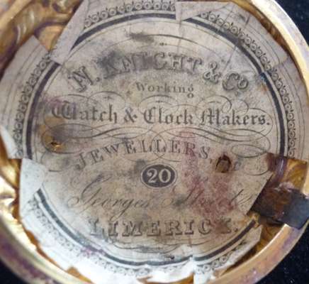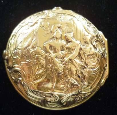 The outer case with repoussé decoration of figures in a room setting, ship in the distance (Departure of Aenas), white enamel dial (cracked) with Roman numerals in black, the key wind movement inscribed and numbered No. 1018 with chain fusee