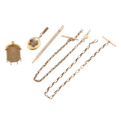 To include: two short Alberts; a Victorian yellow metal oval locket, on a chain, the hinged cover with applied monogram in blue enamel; together with a mesh purse; and a 9ct gold propelling pencil