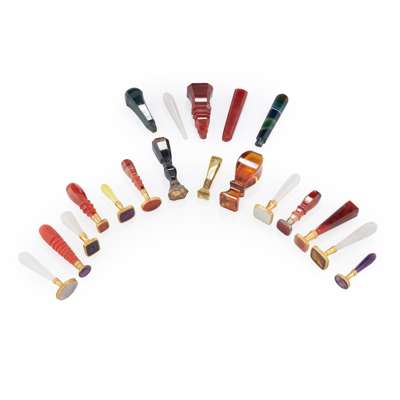 A COLLECTION OF 19TH CENTURY AGATE AND HARDSTONE HANDLED TABLE SEALS