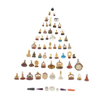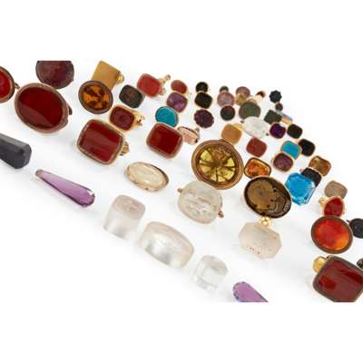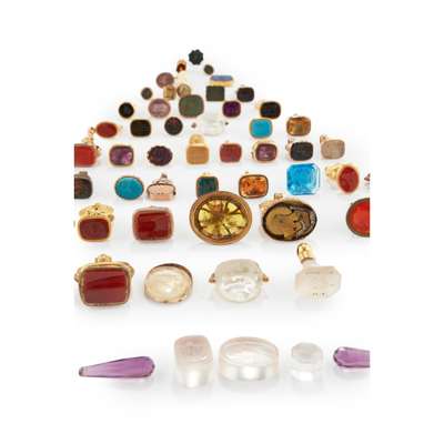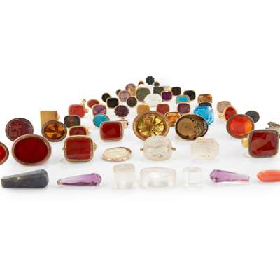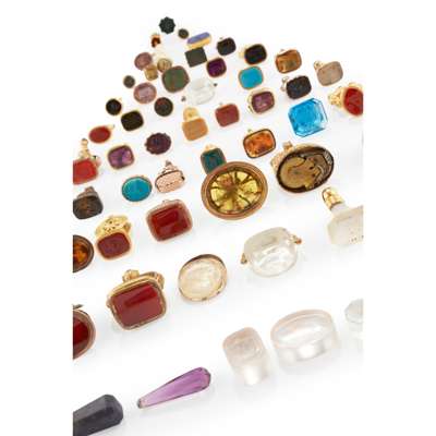 Gilt and other metal mounts, hardstone glass and other intaglios, mainly carved with single words and symbols, swivel and fixed, some plain mounts and handles (quantity)