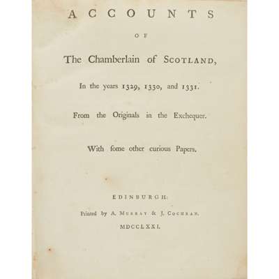 Edinburgh: A. Murray, 1771. 4to; [bound with] [drop-head title] Memorial for the Merchants, Traders and Manufacturers of Glasgow, 1777; [bound with] Thoughts on General Gravitation and views thence arising as to the State of the Universe. London: T. Cadell, 1777. 4to; [bound with] Stuart, Andrew A Letter to the Honourable Directors of the East India Company, December 1778 [and two other similar letters by the same author; [and bound with] and a collection of further works, mostly relating to the Church of Scotland, including an Advertisement Circulatory Letter regarding the start of the Glasgow Courier, dated 1791, contemporary quarter calf with red morocco gilt label to spine, bookplate of James Meek (quantity)