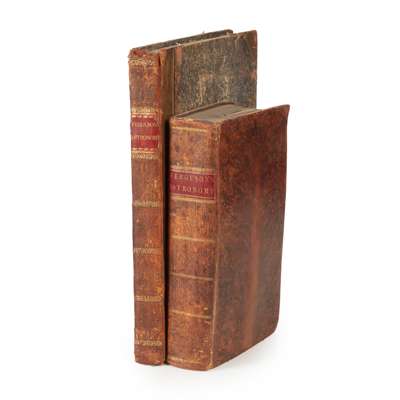London: for the author, 1756. First edition, 4to, folding frontispiece and 13 folding plates, strip torn from lower margin of two Contents leaves, contemporary half calf, title-page very soiled, binding worn; Ferguson, James Astronomy Explained upon Sir Isaac Newton's Principles... eighth edition. London, 1790. 8vo, folding frontispiece and 17 folding plates, contemporary tree calf, red morocco label, short tear to plate 10