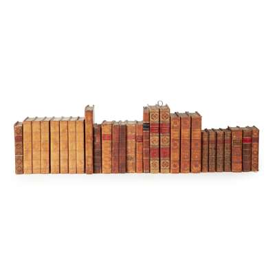Travels of Anacharsis the Younger in Greece. 1806, 8 volumes including 4to atlas of maps, contemporary half calf gilt; Anson, George A Voyage round the World. 1780. 15th edition, 8vo, 3 folding charts, contemporary calf, rubbed; Davy, C. & F. A Relation of a Journey to the Glaciers in the Dutchy of Savoy. 1776, 8vo, contemporary calf, rubbed; Johnson, Samuel A Journey of the Western Islands of Scotland, 1775, 8vo, calf, worn, covers detached; Withington, Nicholas The Travels... a factor in the East Indies. 1746. 8vo, folding map torn without loss, contemporary calf, slightly rubbed; Pennant, Thomas A Tour in Scotland, 1790; A Tour in Scotland and Voyage to the Hebrides. 1890, 2 parts in 2 volumes, plates, uniform calf, slightly rubbed; Eustace, J.C. A Classical Tour in Italy. 1814. 2 volumes, 4to, plates, maps, contemporary calf gilt; and 10 others, sold not subject to return