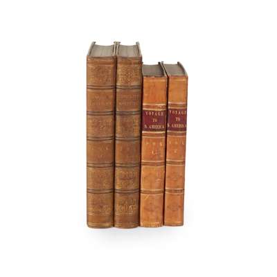 Second edition, 2 volumes, 8vo, map and 12 tinted lithographed plates, contemporary green half morocco, rubbed; Adams, John A Voyage to South America. 1806. 2 volumes, 8vo, fourth edition, 7 maps & plates, several folding, contemporary half calf, slip of paper pasted over owner's name at head of titles, slightly rubbed