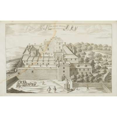 containing the Prospects of their Majesties' Castles and Palaces. Edinburgh, 1814. Folio, 68 (of 69) plates, 2 folding, contemporary half calf, waterstained throughout to varying degrees, title frayed and loose, binding dampstained and worn, cover detached