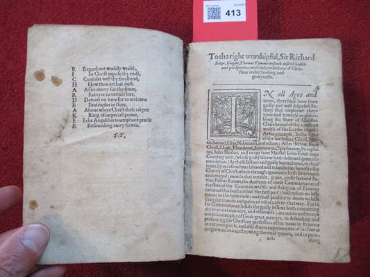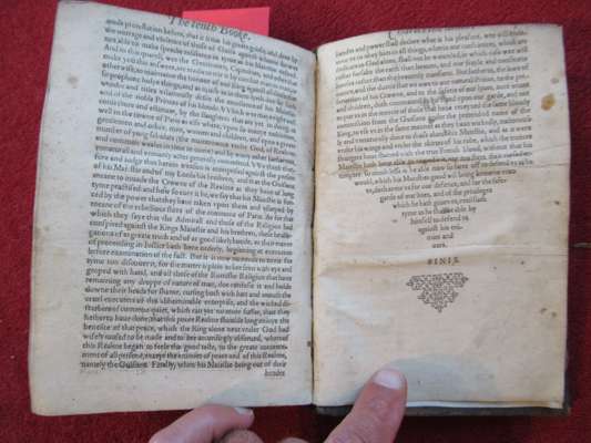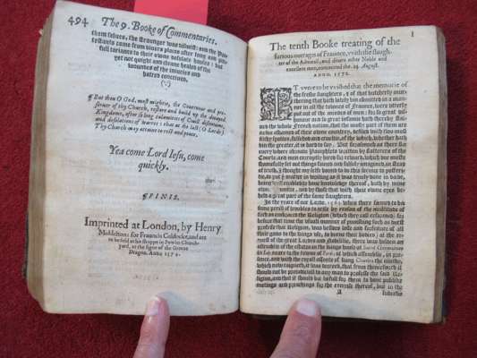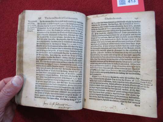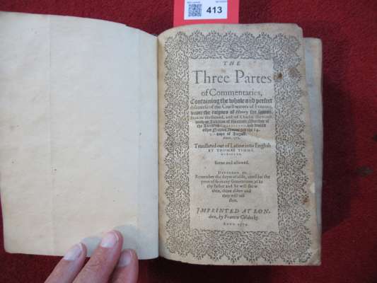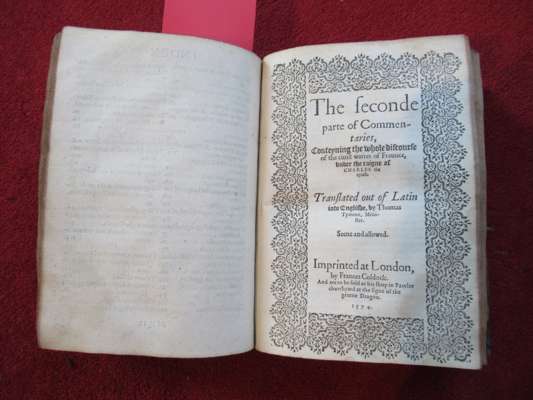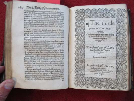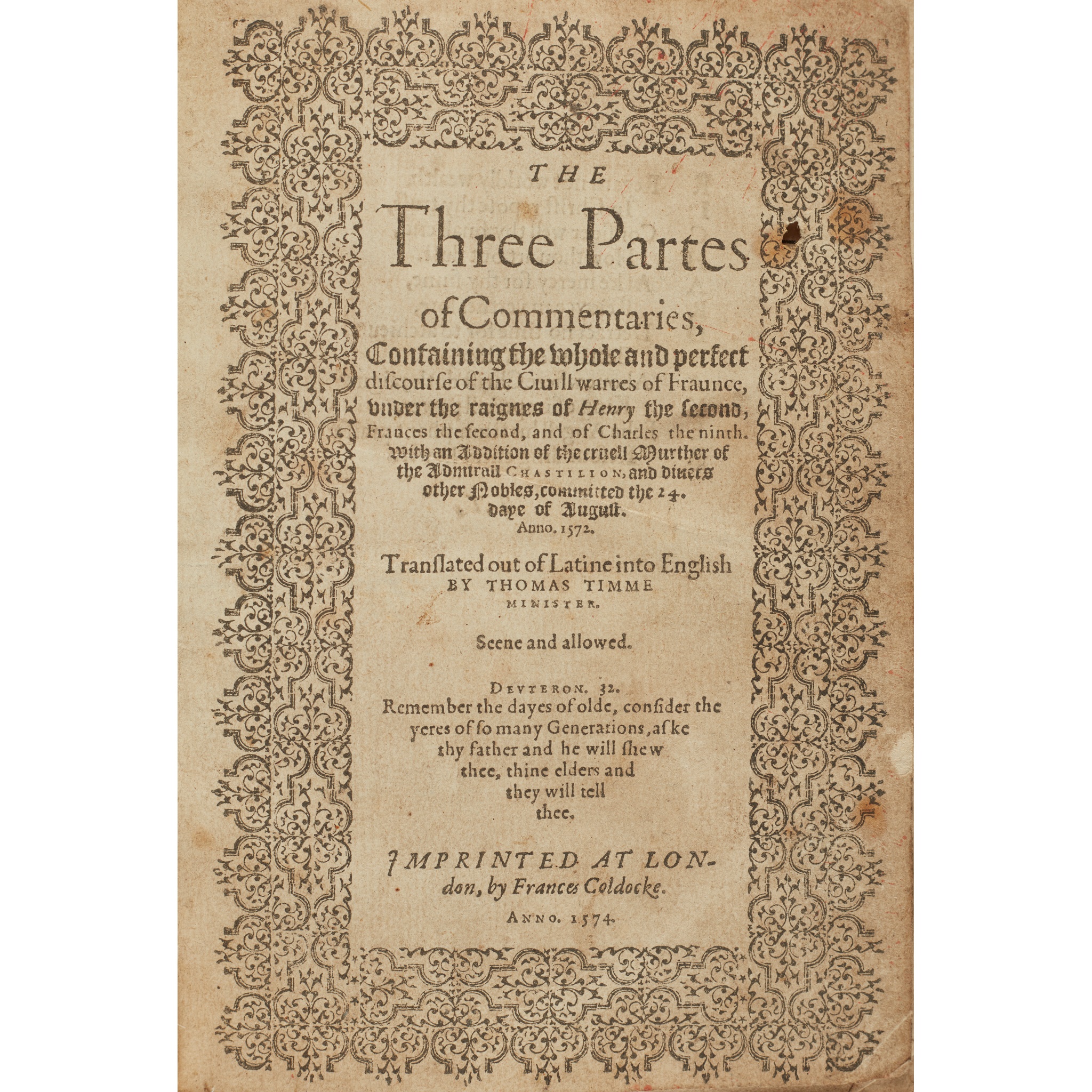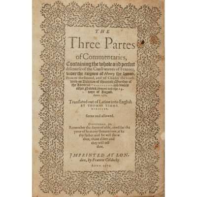 Containing the Whole and Perfect Discourse of the Civill Warres of Fraunce. London: Frances Coldocke, 1574. Small 4to, three volumes bound together, lacking b4 and Al-4 (supplied as blank leaves, using early 18th century Dutch paper), late 16th century calf