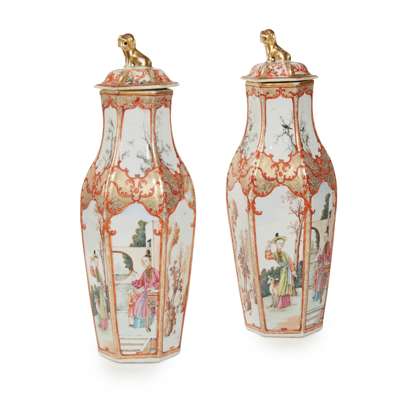 The covers with gilt fu dog finials, the baluster bodies decorated with scenes of ladies in panel lanscapes with iron red and gilt borders
