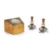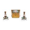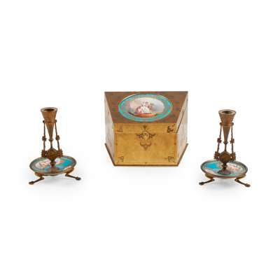 Including a stationery box and a pair of candlesticks, mounted with Sèvres style porcelain