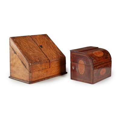 One mahogany with a hinged bow top inlaid with oval shell medallions; the other oak with slant front and a base drawer