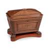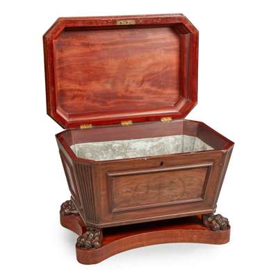 Of sarcophagus form, the hinged top opening to a metal lined interior, raised on paw feet on a concave plinth