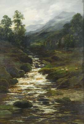 SHEEP GRAZING BESIDE A MOUNTAIN STREAM