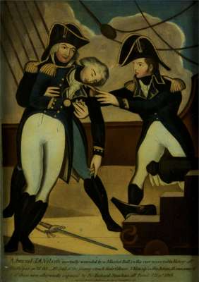 Note: Le Quesne 9. As with similar pictures, the scene is inaccurate, as when struck by the musket ball Nelson fell not into the arms of an officer but on the deck. Nelson was then picked up and carried down to the cockpit on the top deck. Not in the National Maritime Museum, Royal Naval Museum or the Nelson Museum at Monmouth.