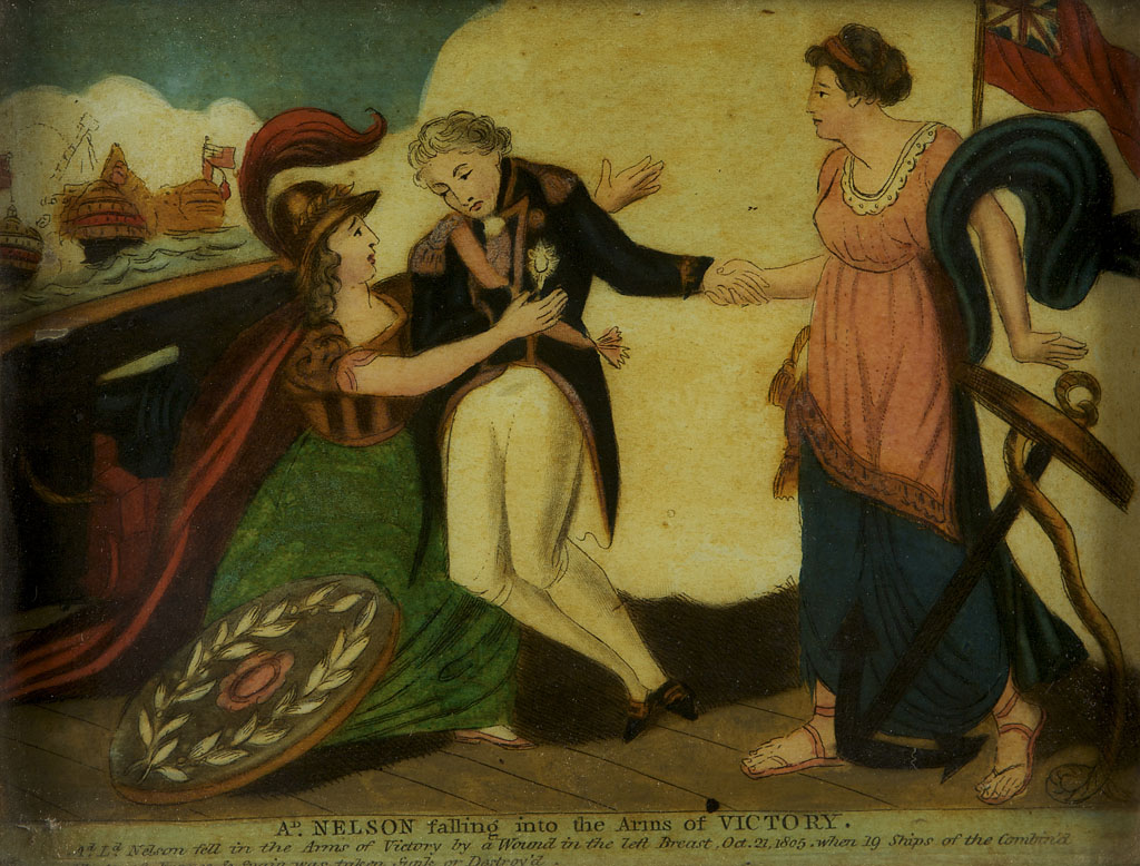 Ad. Nelson falling into the arms of Victory. London: I. Hinton, Jan. 1, 1806. Framed, small size.