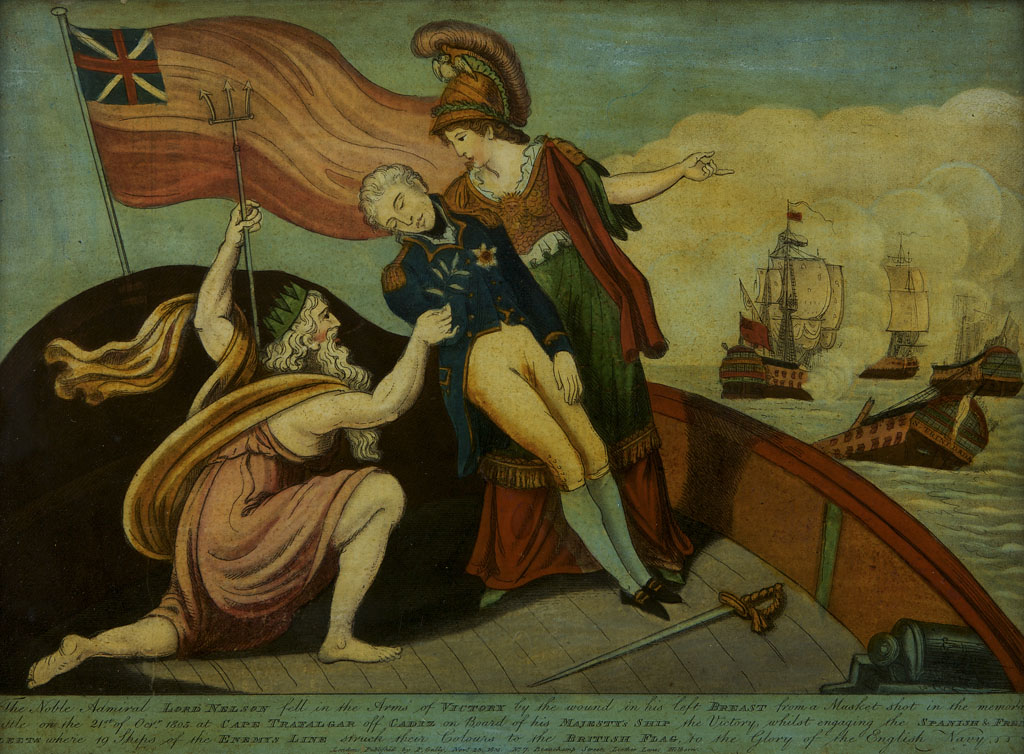 The Noble Admiral Lord Nelson fell in the arms of Victory by the wound in his left breast…. London: P. Gally, March 14, 1806. Framed, large size.