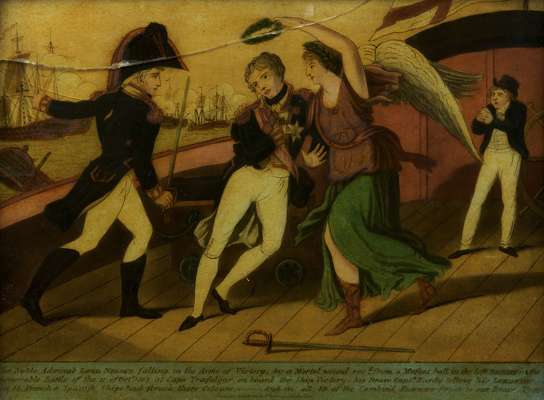 The Noble Admiral Lord Nelson falling in the arms of Victory, by a mortal wound recd. from a musket ball in the left breast … London: P. Patriarcha, March 11, 1806. Framed, large size.