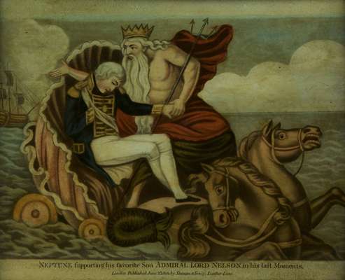 Neptune supporting his favourite son Admiral Lord Nelson in his last moments. London: Stampa & Son, June 2, 1806. Framed, small size.