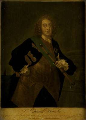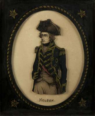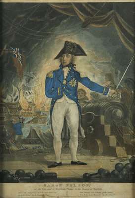 Hand coloured aquatint with etching, London: John Fairburn, Nov. 26, 1798. Framed, 37cm x 25cm; together with 'Sir Edward Hawke', a glass print, 36cm x 26cm; and 'Nelson', a glass print in black, backing missing, 31.5cm x 25cm