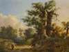 A FIGURE AND DOG ON A TRACK BY AN OLD OAK