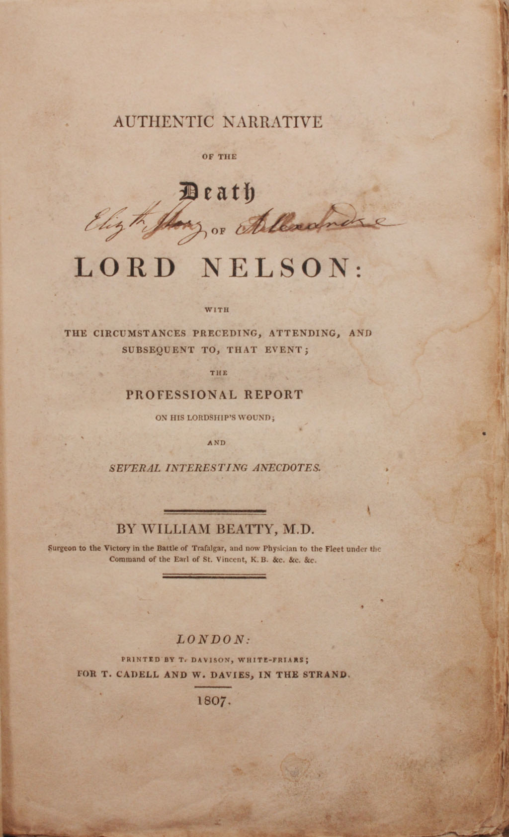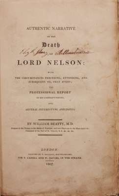 Authentic narrative of the death of Lord Nelson: with the circumstances preceding, attending, and subsequent to, that event; the professional report on his lordship’s wound; and several interesting anecdotes. London: Cadell & Davies, 1807. First edition, 8vo, portrait frontispiece, engraved plate of the ball that killed Nelson, paper boards, printed paper label (not original ?),edges uncut, head and tail restored, boards stained, portrait frontispiece mounted, contemporary ownership signatures on the titlepage and in the margins of the frontispiece, restorations to corners of last couple of leaves.