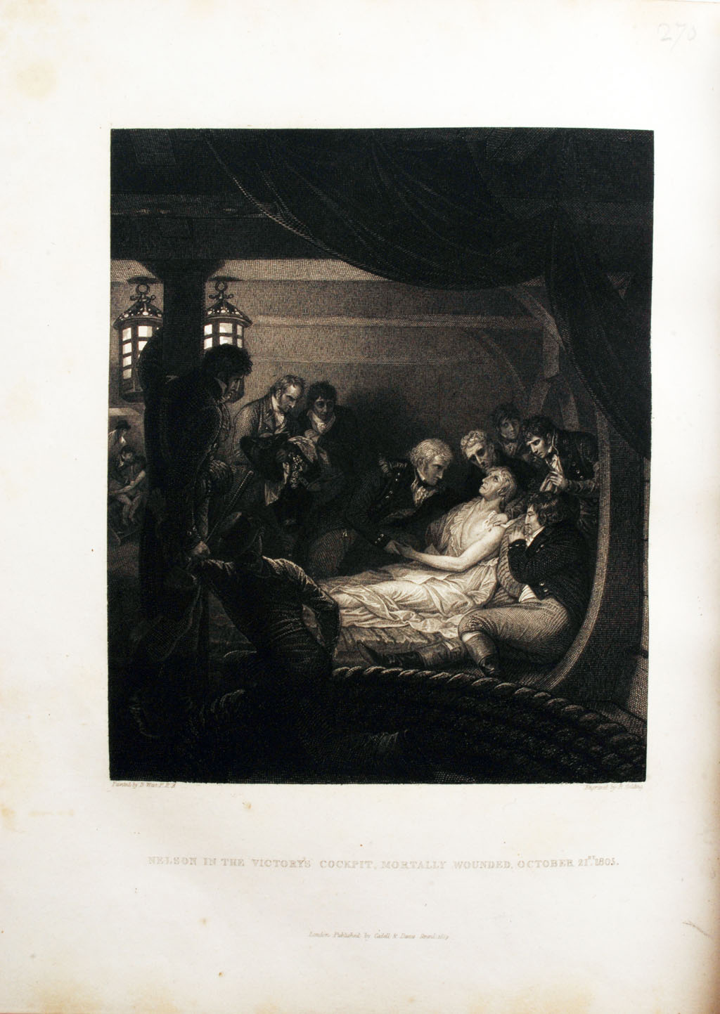 The life of Admiral Lord Nelson, K.B. from his lordship’s manuscripts. London: by T. Bensley for T. Caddel & W. Davies, 1809. First edition, 2 volumes, large 4to., with an engraved frontispiece to volume 1 and 16 other engraved plates, 4 vignettes, with a double page pedigree of the Nelson family, facsims. in the text, contemporary diced Russia, gilt borders of Greek key pattern and palmettes, repeated in smaller tools to form an inner panel, a.e.g., rebacked, edges rubbed, some very slight internal spotting. [2].