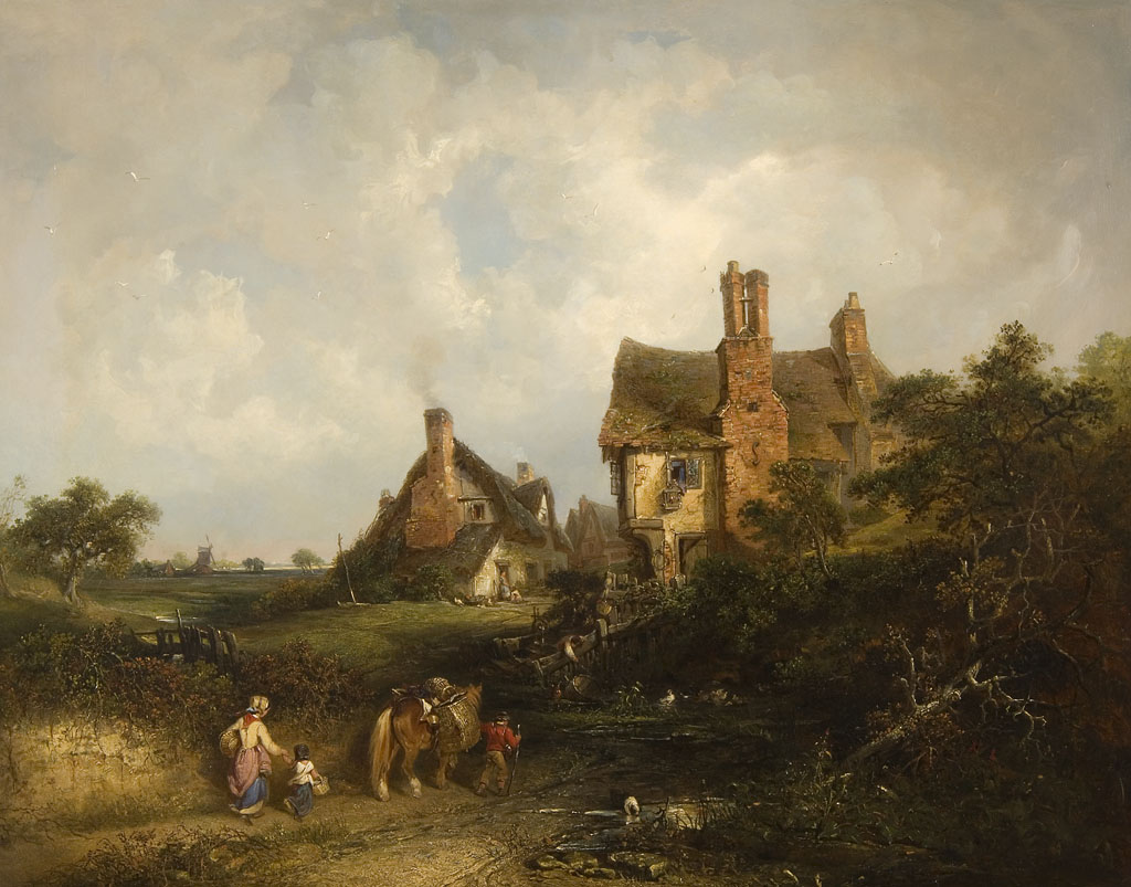 A FAMILY RETURNING FROM MARKET, WITH POND AND HOUSES BEYOND