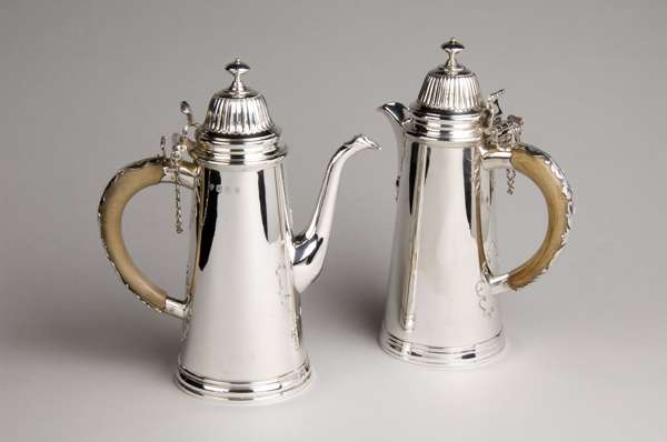 of early 18th century tapered cylindrical form with applied cut card work at handles and spouts, wood handles overlaid with pierced silver strapwork, fluted lids with button finials and with detachable pin hinges (2)