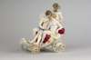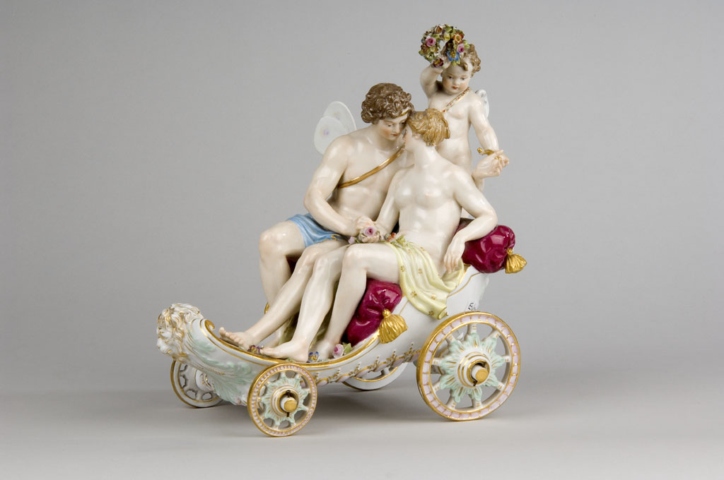 modelled seated in a chariot with a cupid, each scantily clad, Flora holding flowers, Cupid with a bow, quiver and holding a floral wreath, the chariot of oval form with lion head mascot, the wheels with pierced leaf devices, painted blue cross swords mark and impressed A84