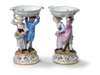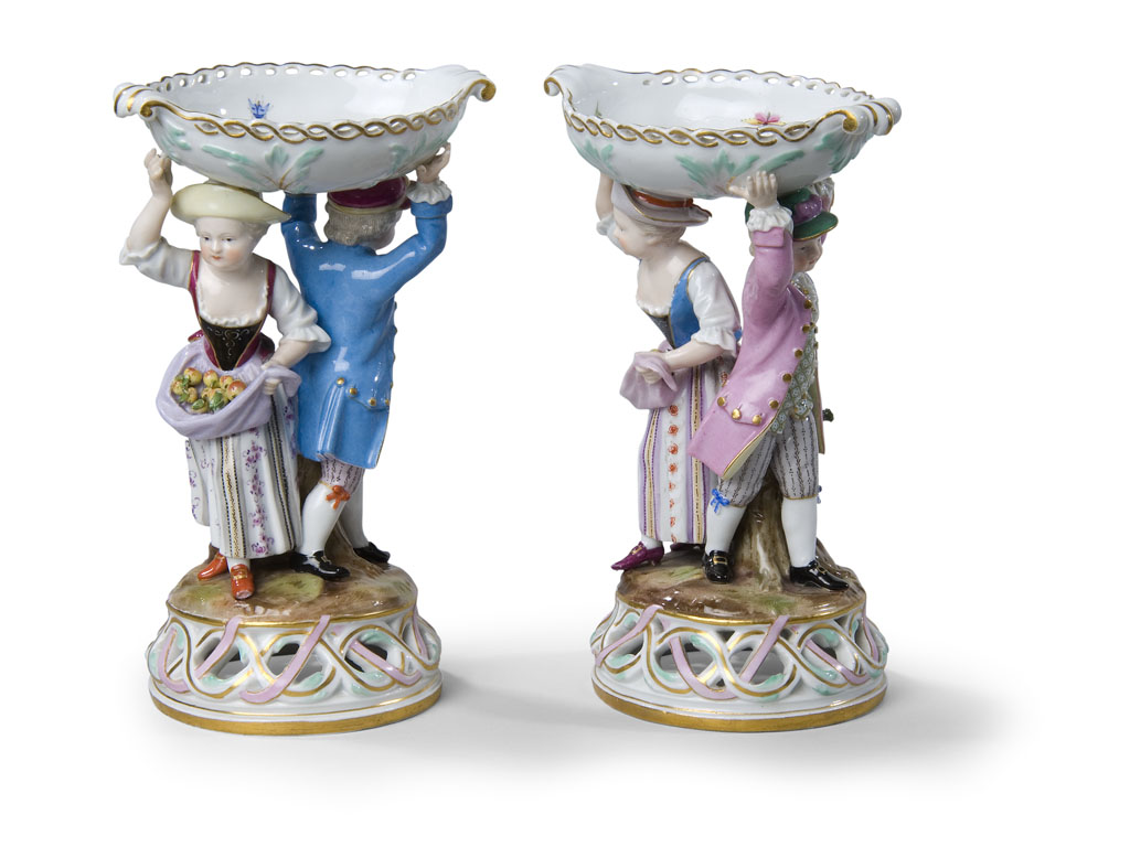 modelled as a boy and girl holding baskets above their heads, on pierced circular bases, outside decorated, blue crossed mark