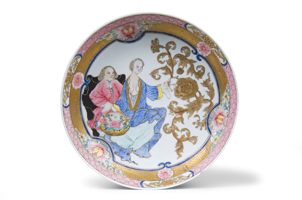 the plateau painted with a European man presenting a basket of flowers to a Chinese semi-draped courtesan, within gilded mesh and pink ocatagon borders interspersed with panels of flowers and gilded scrolls