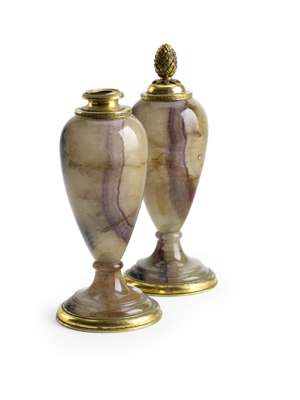 each of slender shouldered baluster form, the reversible ormolu covers banded with engine-turned stars and cast with pine cone finials, with candle sconces verso, on gilt metal plinth bases (2)