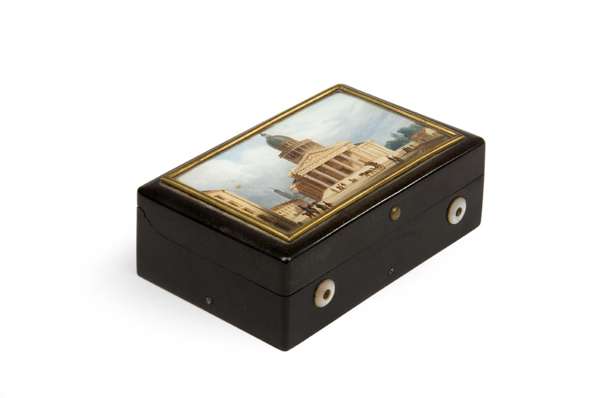 playing two airs, the lid inset with an indistinctly signed panel of a neo-classical church, the movement stamped ‘F. Alibert’, the rectangular casing stamped to the front with retailers’ mark ‘Keith Prowse & Co./48 Cheapside/London’