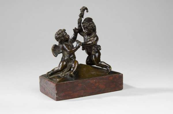 each frolicking, one wearing a Mr Punch hooded cape and wielding a baton modelled as Punch, on rectangular red mottled marble base