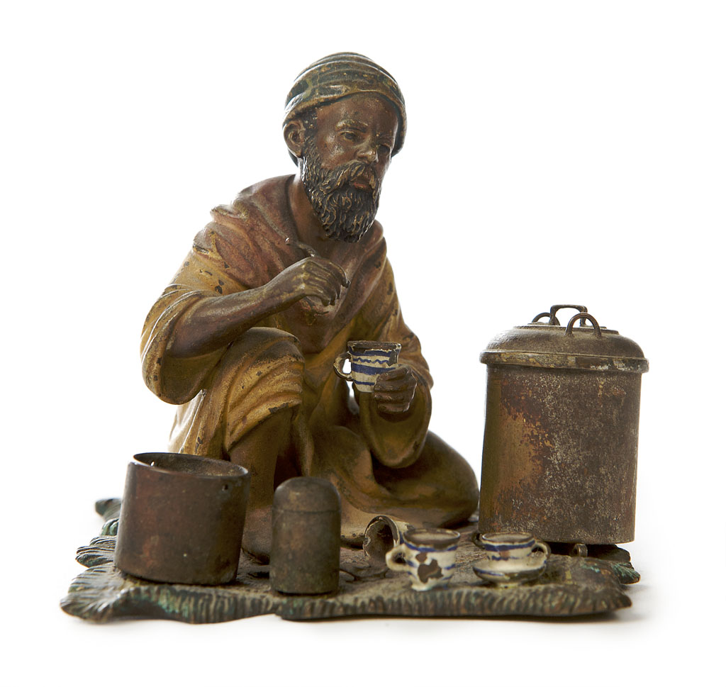 painted in polychrome colours and modeled as a seated arab drinking coffee