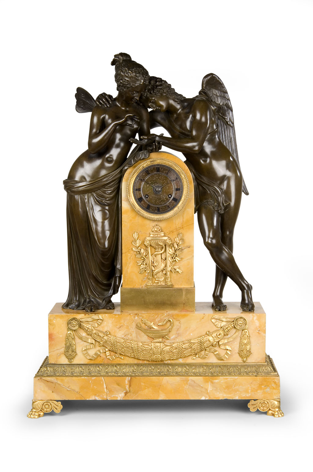 the silvered dial in domed case flanked by bronze figures of Cupid and Psyche, the marble applied with gilt-bronze neo-classical motifs, on winged paw feet