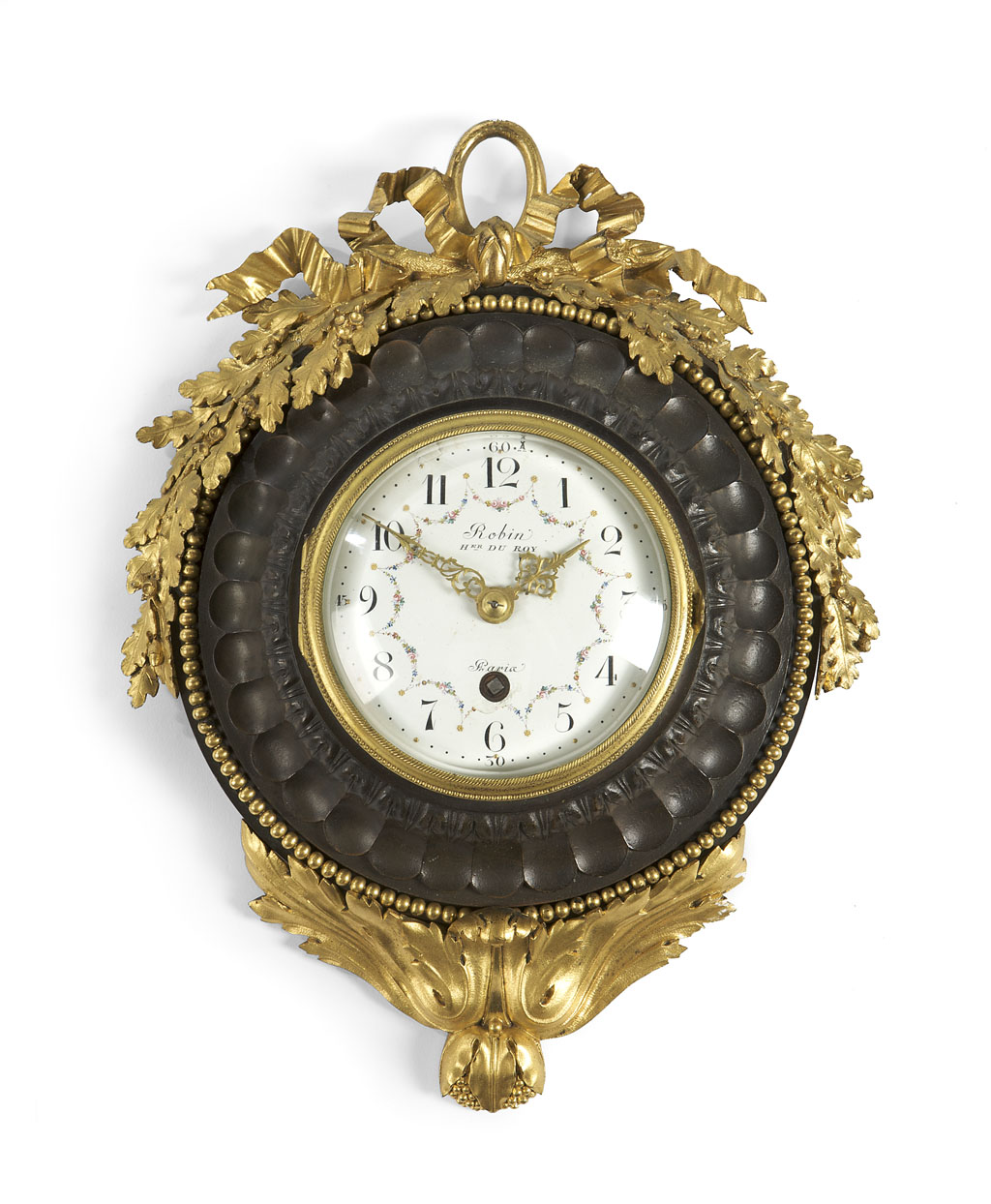 the white enamel and floral painted dial signed 'Robin, Hor Du Roy, Paris', the fluted case surmounted by an oak leaf and ribbon tied crest
