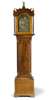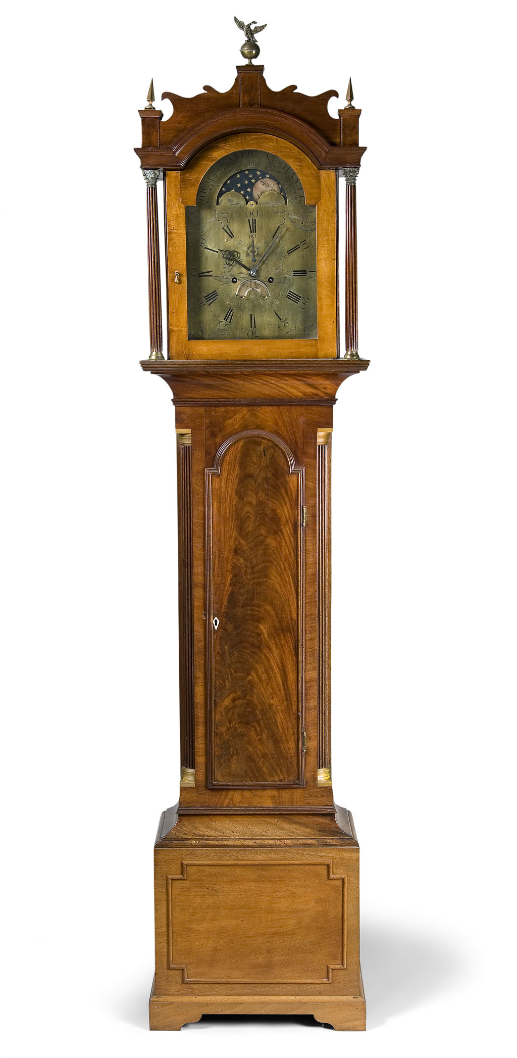 the break arch brass dial signed ‘Roger Wearn/St. Erth’ with moon phase and ‘High Water Mark at Hayle’, eight day bell striking movement, the hood with shaped top and fluted columns, the trunk with break arch door and fluted quarter columns, square base and bracket feet