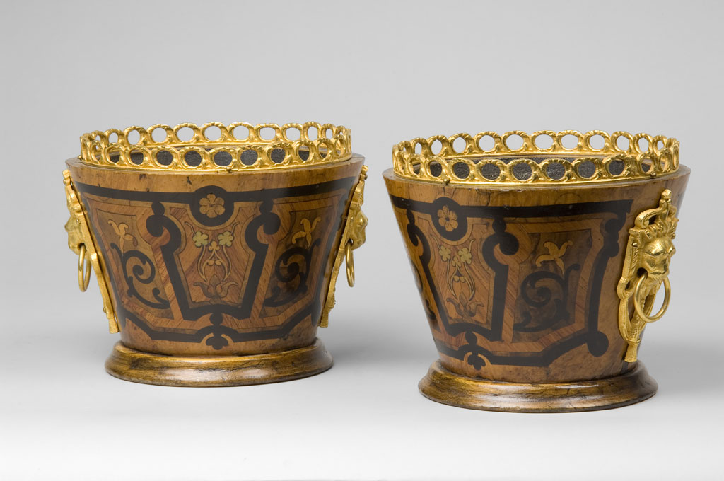 the short tapering cylindrical bodies with gilt-metal openwork rims and lion mask drop ring handles between strapwork marquetry panels