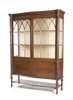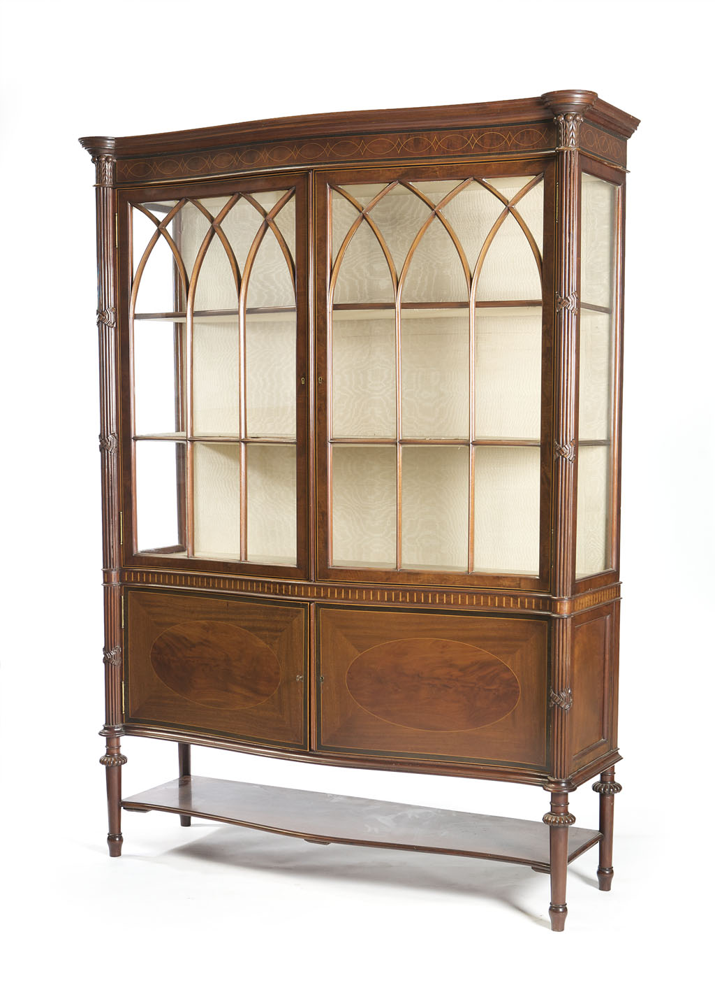 the moulded cornice with outset corners above a pair of astragal arched glazed doors enclosing a lined shelved inetrior, flanked by reeded ribbon carved pilasters and above two further apron cupboard doors, raised lobed turned tapered legs united by a shaped undertier