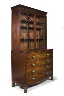 with an arcaded cornice and arched astragal glazed doors enclosing adjustable shelves, the lower section with fall front drawer enclosing a satinwood fitted interior with baize writing surface, three long graduated drawers below, on splayed bracket feet