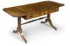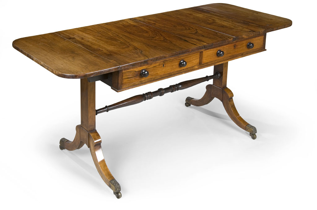the rectangluar top above a pair of frieze drawers with dummy drawers to reverse, on standard end supports and outswept legs terminating in brass cappings and castors and united by a turned stretcher