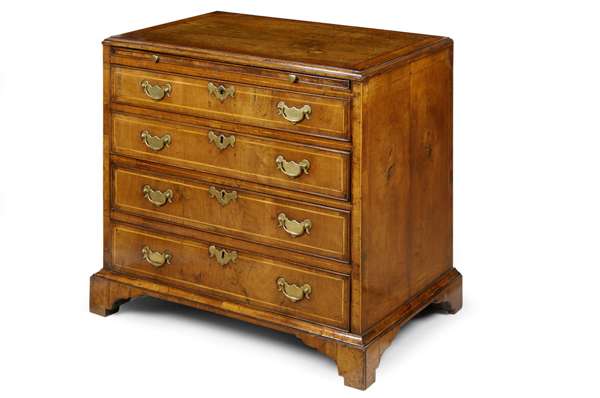 the crossbanded moulded rectangular top above a brushing slide and four long graduated drawers, on bracket feet, inlaid with stringing