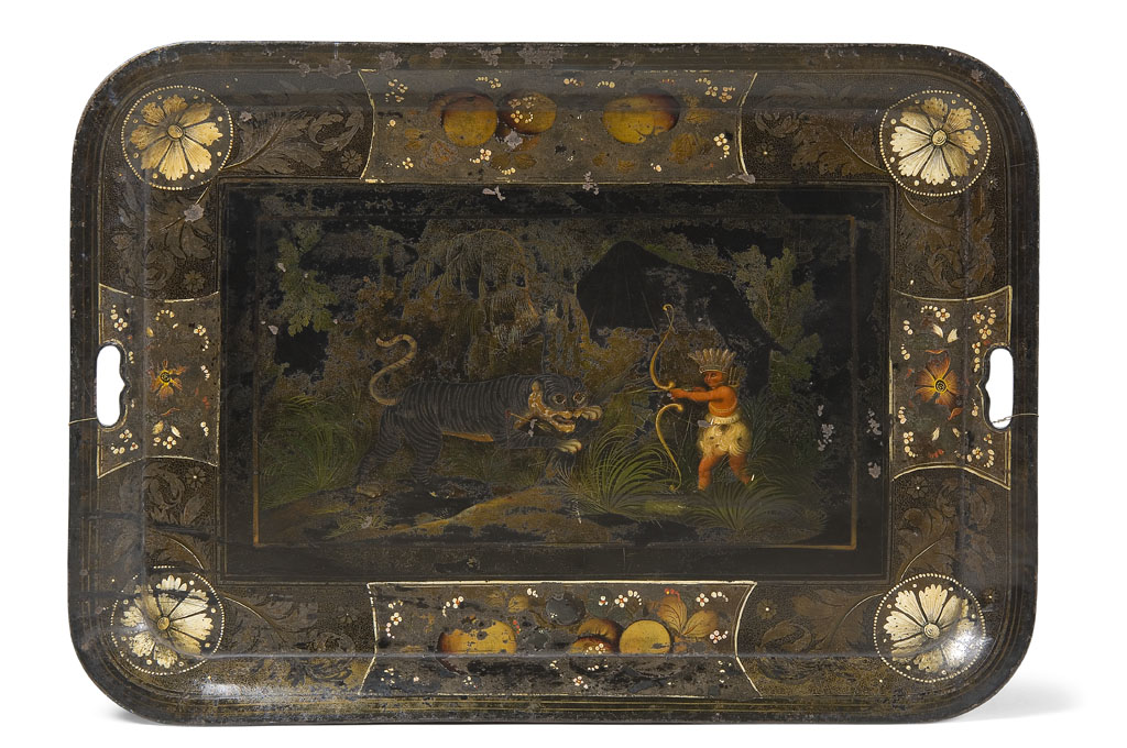 painted with a jungle scene depicting an Indian warrior shooting a tiger with an arrow within a foliate border