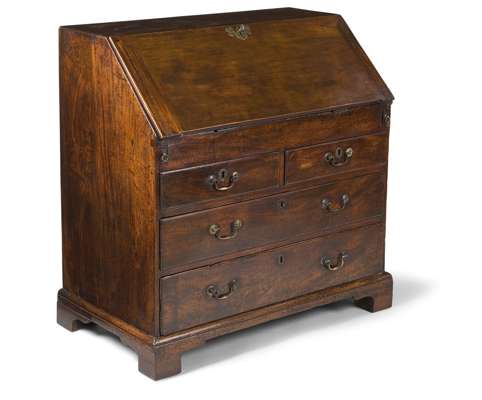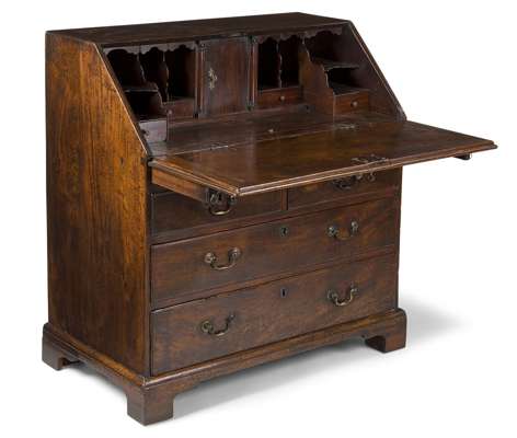 fall front enclosing a stepped fitted interior and covered well, with two short and two long graduated drawers, on bracket feet