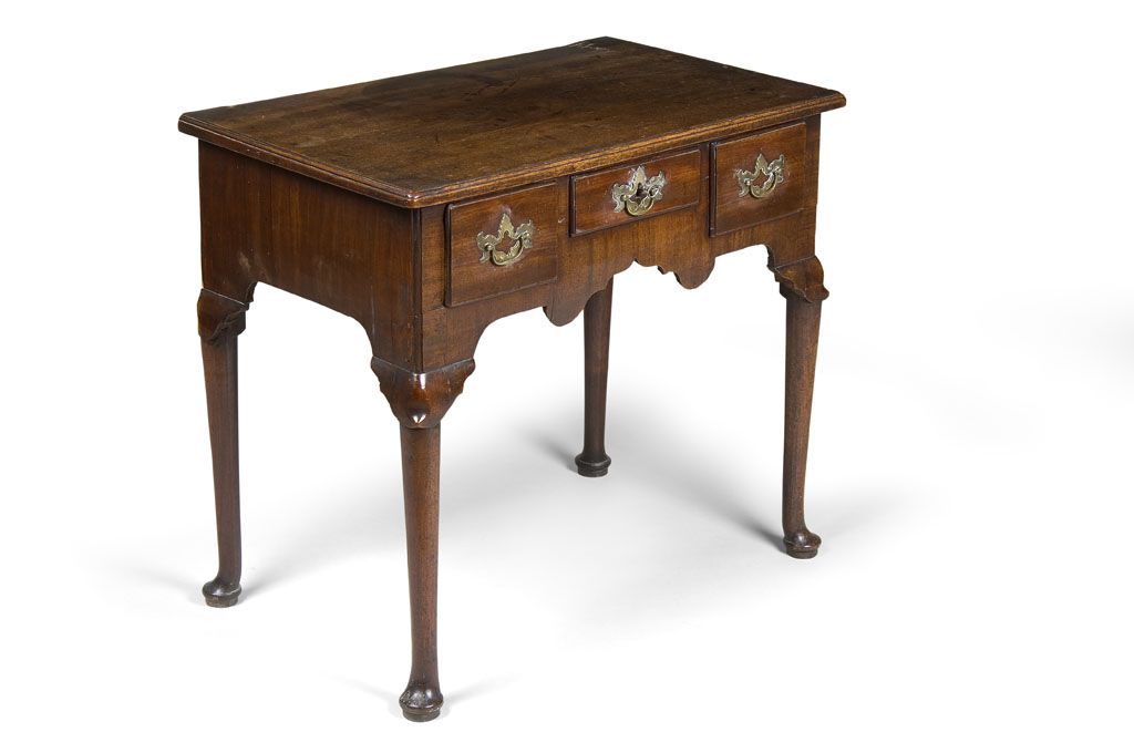 the moulded top above three frieze drawers and a shaped apron, on lappet clad tapered legs ending in pad feet